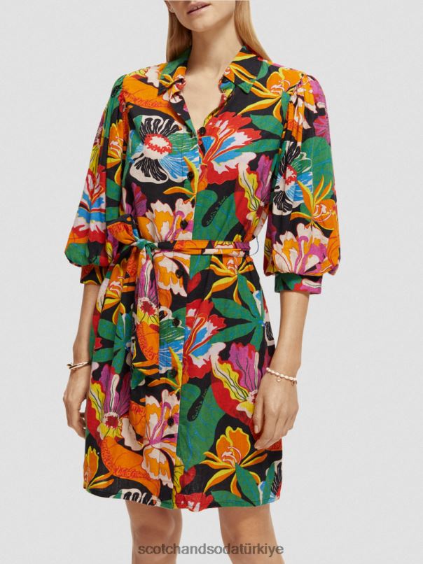 Scotch & Soda Türkiye | Scotch & Soda Keten karıştırılmış puflu mini elbise kadınlar F4B4N7 çiçek