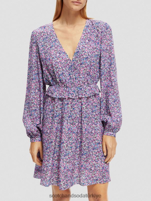 Scotch & Soda Türkiye | Scotch & Soda Uzun kollu baskılı v yaka mini elbise kadınlar F4B4N29 Rosaria Mor