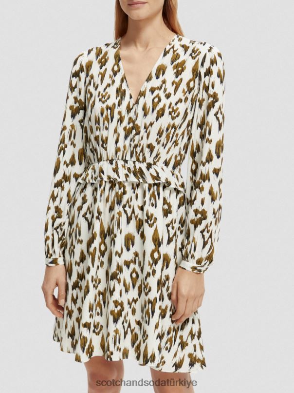 Scotch & Soda Türkiye | Scotch & Soda Uzun kollu baskılı v yaka mini elbise kadınlar F4B4N27 fırçalanmış Ikat ordu yeşili